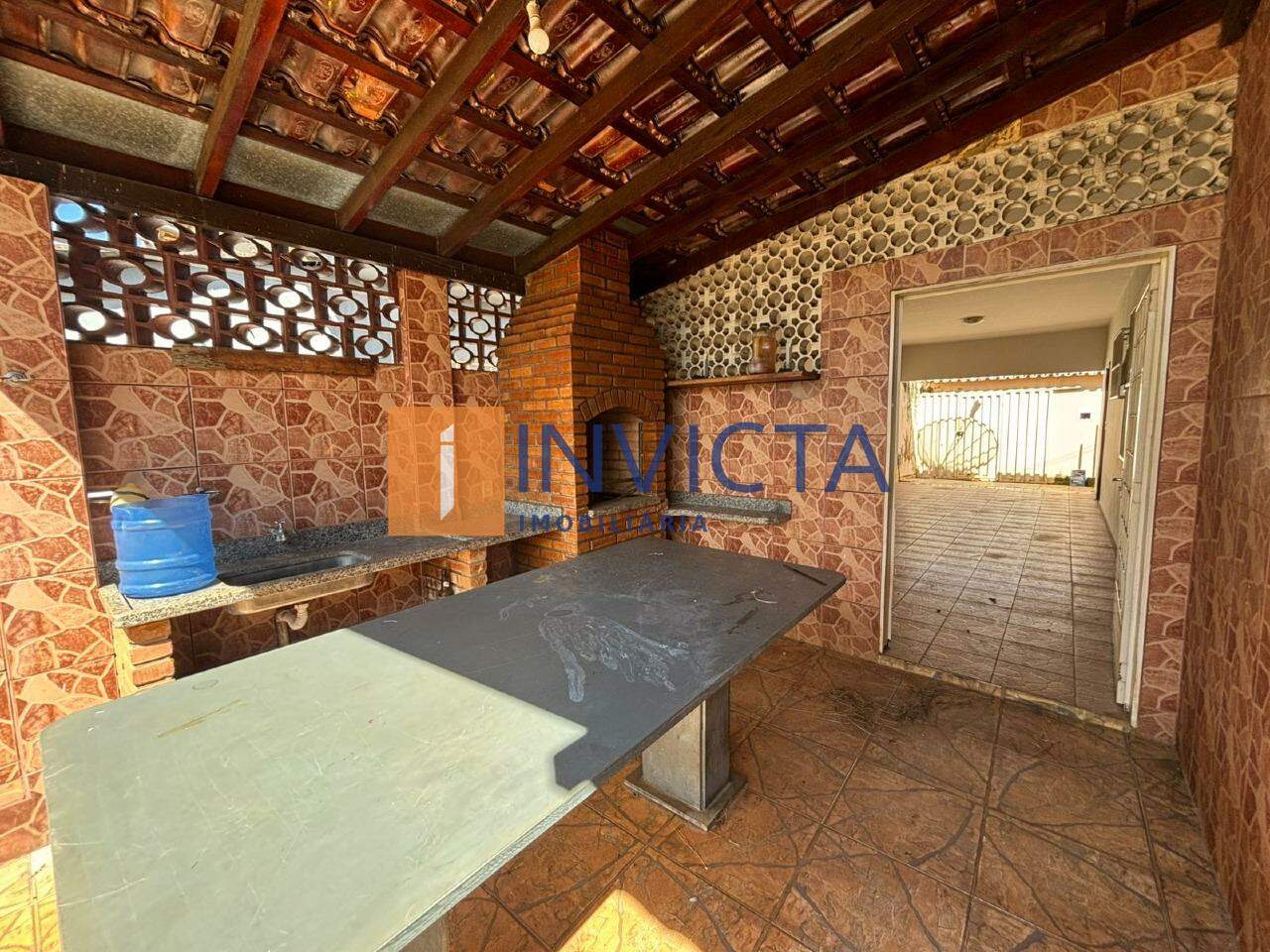 Casa com dois quartos, sendo uma suíte, sala, copa, cozinha com armários sob a pia, banheiro social, cozinha e área de serviço, varanda com churrasqueira, garagem para dois carros enfileirados e quintal amplo.